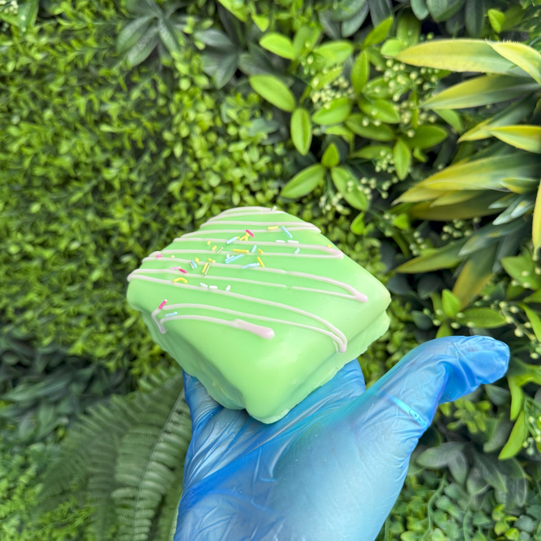 Big, bold, and 100% plant – powered! Fluffy vegan maderia sponge, with creamy vegan frosting and topped with dairy-free icing. All the classic French fancy love – just kinder to the planet